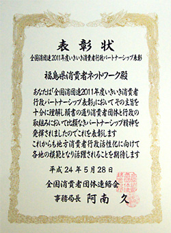 福島県消費者ネットワークでは、去る5月30日開催された消費者庁主催「消費者シンポジウム」の席上、平成24年度「いきいき消費者行政パートナーシップ表彰」を授賞しました。