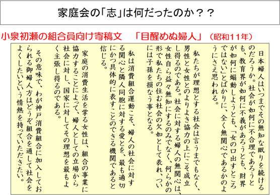 特に、「台所からの革命」とも言われた協同組合運動は、その創生期から女性が活躍。1924年(大正13年)に神戸消費組合、1929年(昭和4年)に灘購買組合に「家庭会」が誕生。料理、生け花、洋裁、編み物などの講習会を開く一方、不用品交換会や政治経済問題を解説する講演会も催し、生協活動への理解を深耕。家庭会は、生協運動の輪を広げると同時に、生活文化活動の基礎を築いたというお話をいただきました。