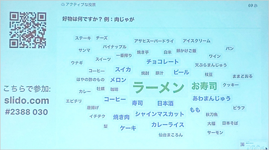この設問もオープニングと同じ、参加者がスマホで、次から次と打ち込んでいくと、同じ答えの文字が大きくなっていきます。