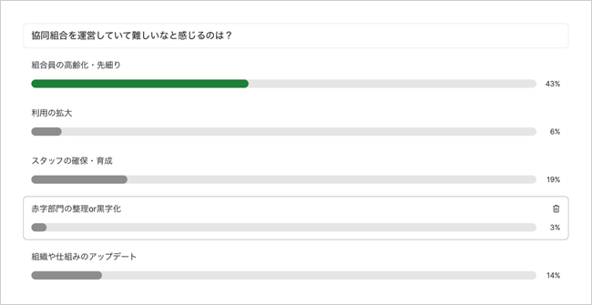 組合員の高齢化・先細りやスタッフの確保・育成といった人材への悩みが多くありました。